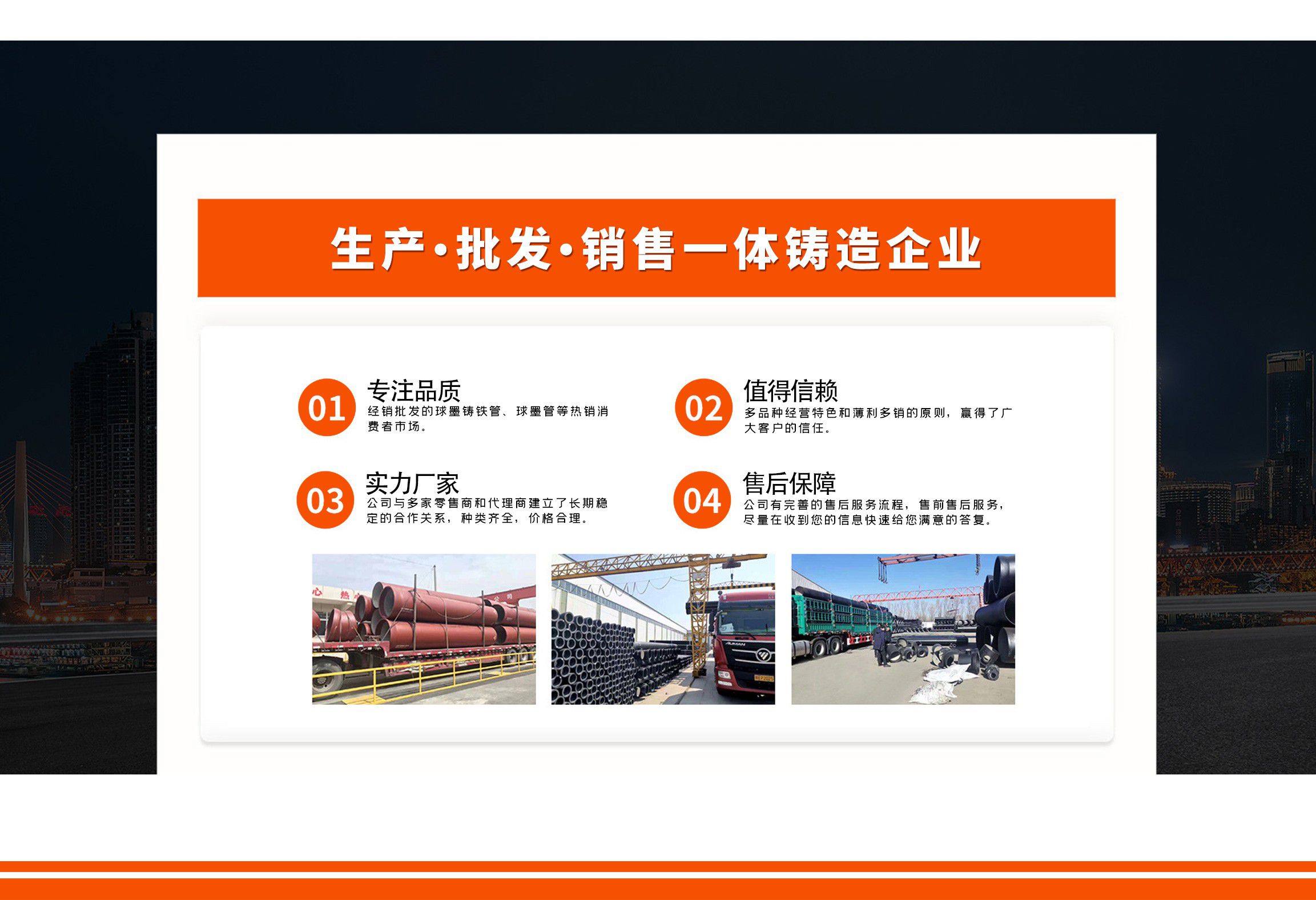 青島金源達(dá)管業(yè)有限公司主要經(jīng)營(yíng)各種規(guī)格球墨鑄鐵管,球墨管,球墨鑄鐵管廠家等產(chǎn)品,質(zhì)量可靠,誠(chéng)信經(jīng)營(yíng),值得信賴! 青島金源達(dá)管業(yè)有限公司始終堅(jiān)持“誠(chéng)信立業(yè),追求卓越,合作共贏,共同發(fā)展”,竭誠(chéng)歡迎各界朋友來(lái)廠參觀指導(dǎo),洽談業(yè)務(wù)。我們?cè)概c您攜手共進(jìn),互惠雙贏,共創(chuàng)未來(lái)! 公司堅(jiān)持“以?shī)^斗者為本”的理念,關(guān)心關(guān)愛職工,職工的獲得感、幸福感更加充實(shí)、更有保障、更可持續(xù);秉承“忠誠(chéng)企業(yè)、勇于擔(dān)當(dāng)、開拓創(chuàng)新、主動(dòng)作為”,堅(jiān)持黨建領(lǐng)航、創(chuàng)新驅(qū)動(dòng)、文化塑魂、奉獻(xiàn)社會(huì),全面致力于綠色、低碳、高效、高質(zhì)量發(fā)展。 愿與各界朋友攜手并進(jìn),共創(chuàng)未來(lái)!...